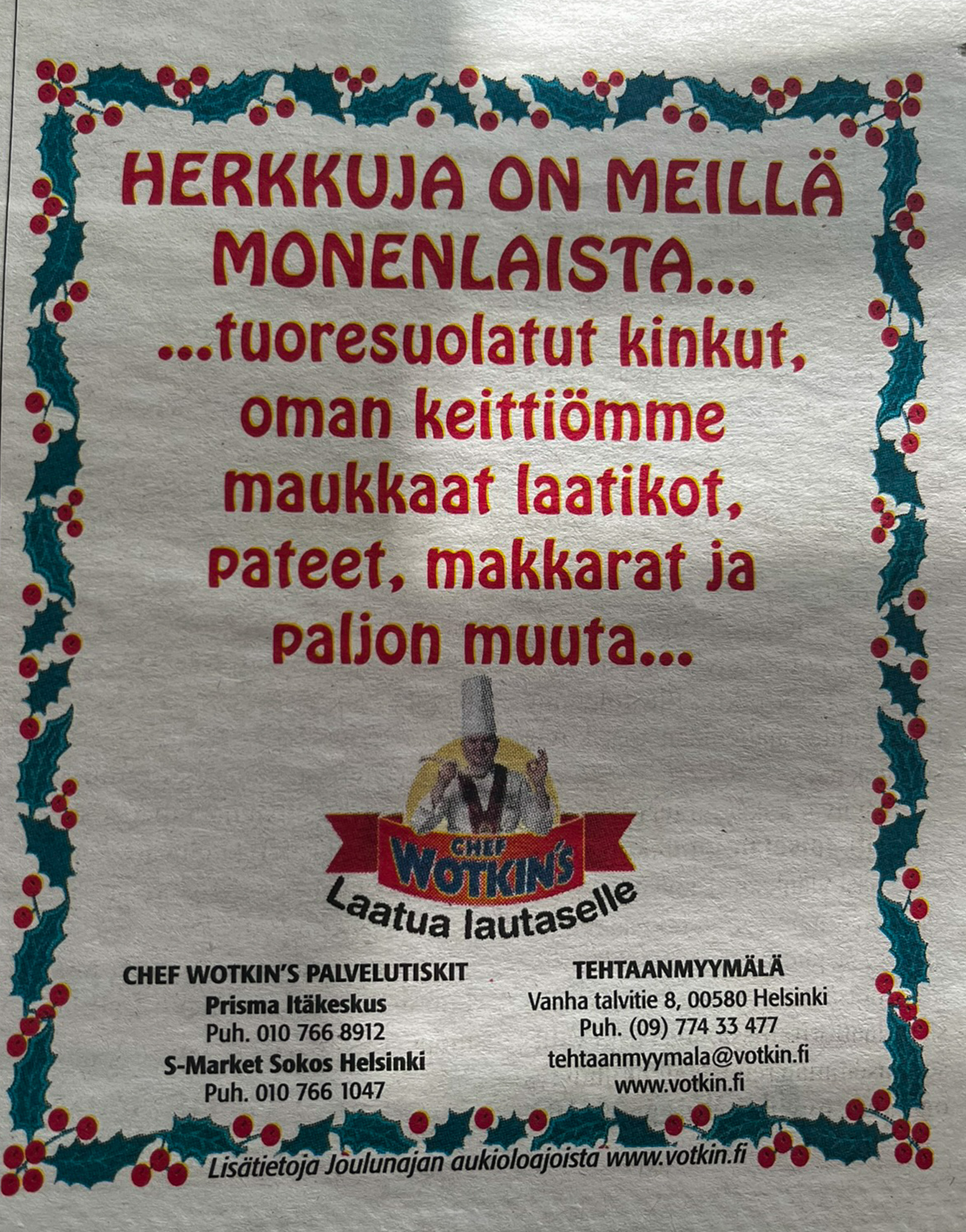 Helsingin Tukkutorilla toimiva Chef Wotkin’sin tehtaanmyymälä ja Lihatukku Veijo Votkin Oy osoitteessa Vanha talvitie 8 myy lihaa ja lihajalosteita.
