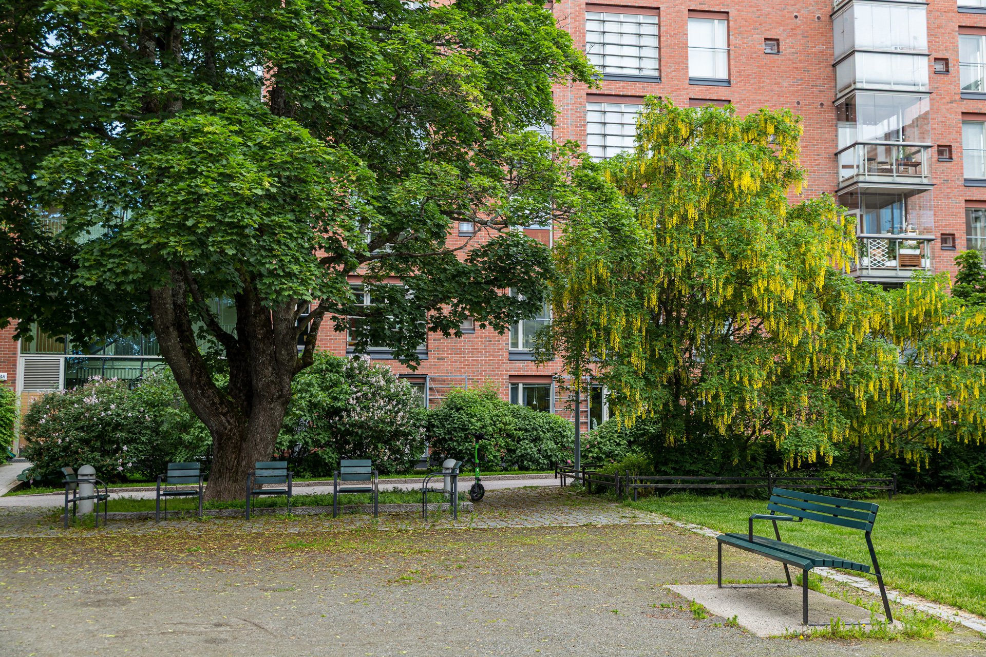 Eläinlääkärinkatu 3:n rakennus kuvattuna sisäpihalta eli Eläinlääkärinpuistosta 17.5.2018