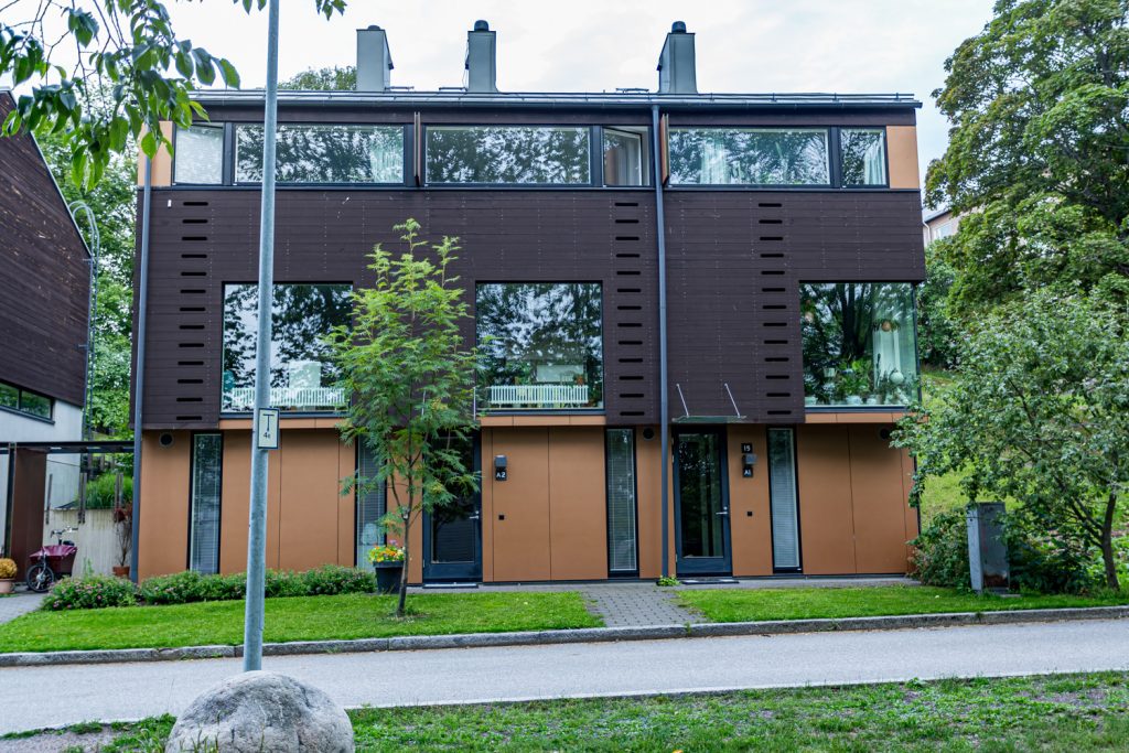 Kappale vanhaa Hermannia Violanpuiston reunalla: Saarenkatu 15:ssä on vuonna 1910 valmistunut vanha rakennus sekä kolme vuonna 2009 valmistunutta uudisrakennusta.